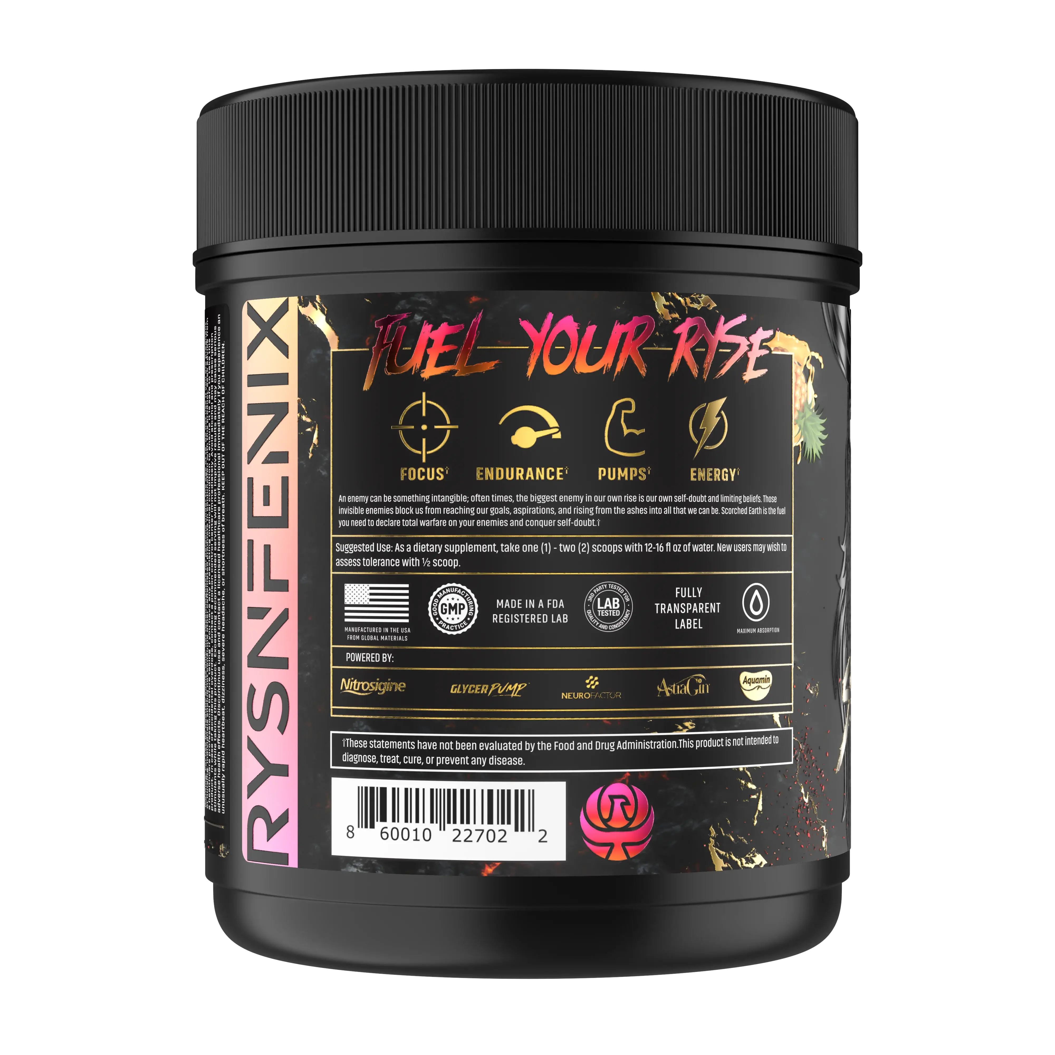 We at RysnFenix decided to name this Pre-workout Scorched Earth because an enemy can be something intangible; often times, the biggest enemy in our own rise is our own self-doubt and limiting beliefs. Those invisible enemies block us from reaching our goals, aspirations, and rising from the ashes into all that we can be. We want you to use this amazing pre-workout as a fuel to declare total warfare on your enemies with a Scorched Earth approach.