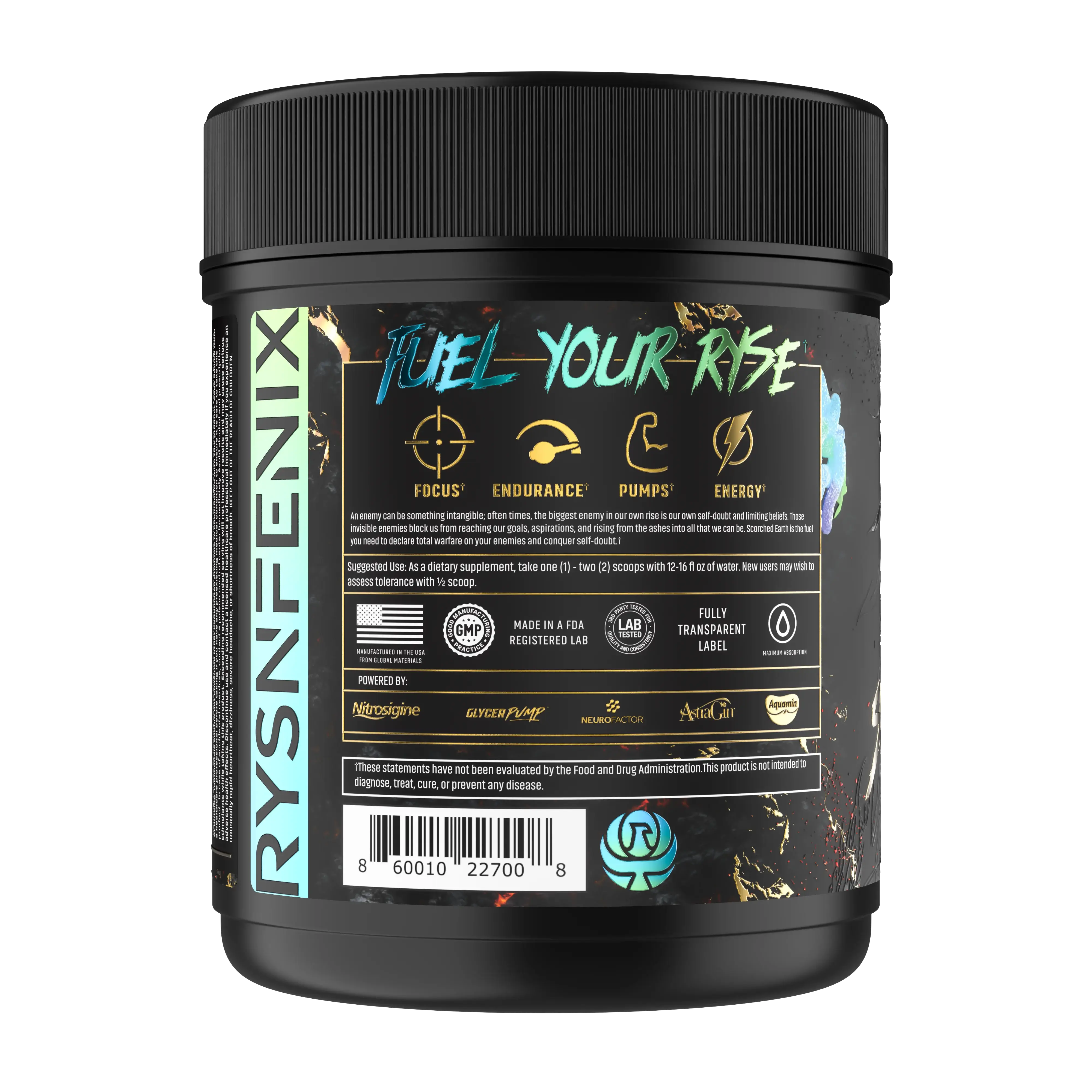 We at RysnFenix decided to name this Pre-workout Scorched Earth because an enemy can be something intangible; often times, the biggest enemy in our own rise is our own self-doubt and limiting beliefs. Those invisible enemies block us from reaching our goals, aspirations, and rising from the ashes into all that we can be. We want you to use this amazing pre-workout as a fuel to declare total warfare on your enemies with a Scorched Earth approach.