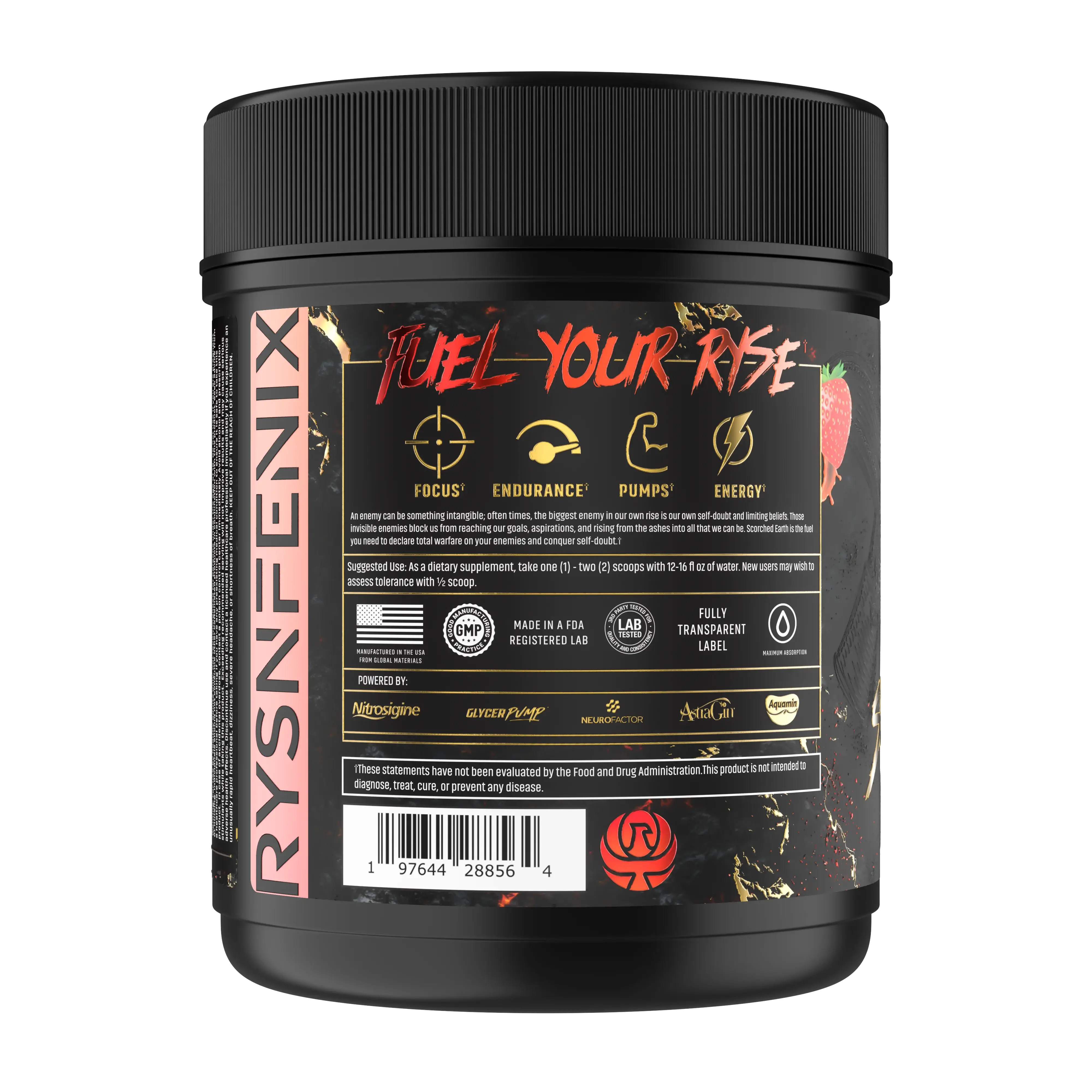 We at RysnFenix decided to name this Pre-workout Scorched Earth because an enemy can be something intangible; often times, the biggest enemy in our own rise is our own self-doubt and limiting beliefs. Those invisible enemies block us from reaching our goals, aspirations, and rising from the ashes into all that we can be. We want you to use this amazing pre-workout as a fuel to declare total warfare on your enemies with a Scorched Earth approach.